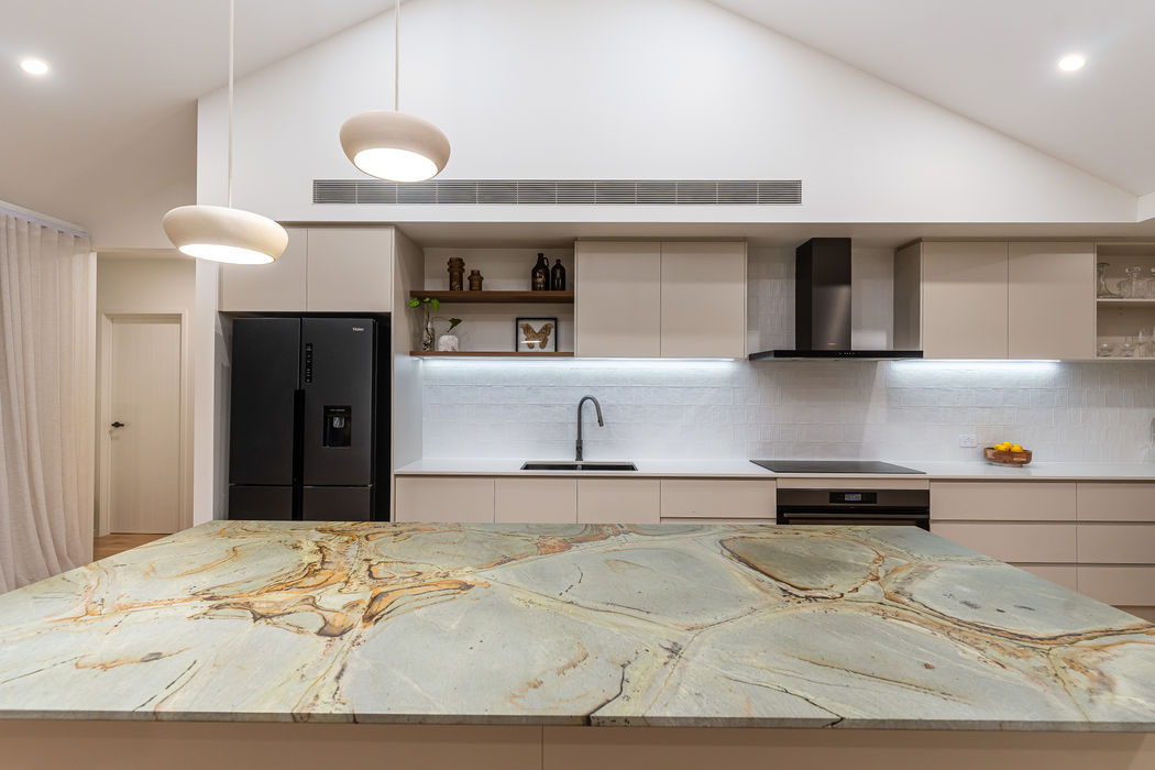 At Zarko Homes, we design homes that feel as good as they look. Inside, soaring rake ceilings enhance the open-plan layout, inviting in natural light and creating a sense of warmth and openness. The heart of the home is the gourmet kitchen, where a natural stone island bench and handcrafted Italian brickwork bring elegance and lasting appeal.